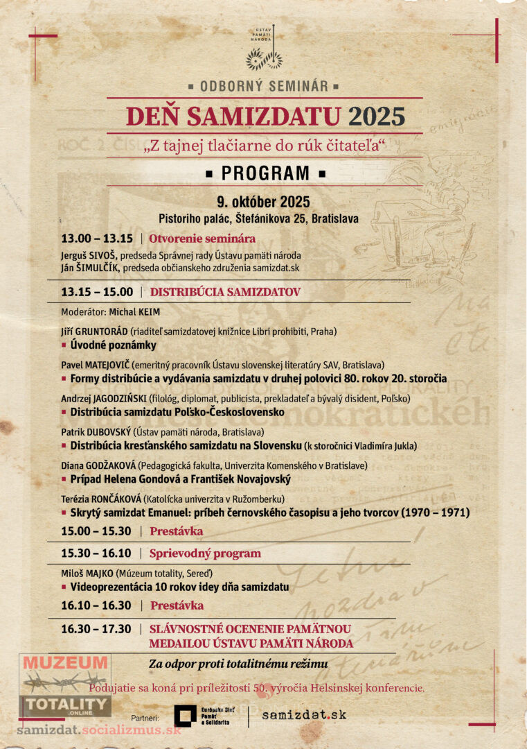 Bude to práve Múzeum totality, ktoré prezentáciou z vlastného archívu predstaví predchádzajúcich 9 ročníkov Dňa samizdatu a aj úvodného stretnutia v knižnici Libri prohibiti.