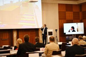 Generálny sekretár Zväzu priemyselných výskumných a vývojových organizácií (ZPVVO), Dr.h.c. doc. Ing. Juraj Wagner, CSc., vystúpil na prednáške s témou „Aktivity Zväzu priemyselných výskumných a vývojových organizácií v oblasti výskumu, vývoja a inovácií“. Vo svojom vystúpení priblížil poslanie, ciele a široké spektrum činností tejto dobrovoľnej, neziskovej a nezávislej záujmovej organizácie. ZPVVO združuje výskumné organizácie na Slovensku, ktorých primárnym predmetom činnosti je výskum, vývoj, vzdelávanie, certifikácia a súvisiace činnosti ako je projekcia, výroba, montáž a prevádzka zariadení. Hlavným cieľom Zväzu je dôsledne obhajovať záujmy svojich členov pri rokovaniach s orgánmi štátnej správy a inými inštitúciami, ktoré sa priamo dotýkajú prípravy strategických, koncepčných a rozvojových zámerov vedy, výskumu, inovácií a systému ich financovania, ako aj dôležitej prípravy mladej generácie pre prax v priemysle. ZPVVO zároveň zastupuje svojich členov pri príprave a prerokovaní výskumno-vývojových programov v rámci vednej, technickej a priemyselnej politiky s príslušnými štátnymi orgánmi a ich agentúrami. Nezanedbateľná je aj koordinačná funkcia, kedy Zväz koordinuje činnosť a spoluprácu s jednotlivými sektormi vedy a techniky pri tvorbe spomenutých zámerov a pri príprave a realizácii rozhodujúcich výskumných programov s agentúrami podporujúcimi vedu a výskum. Medzi ďalšie kľúčové aktivity patrí podpora rozvoja technickej normalizácie a jej harmonizácie s EÚ, koordinácia rozvoja skúšobníctva, metrológie a presadzovanie systémov kvality, ako aj podpora informatizácie a digitalizácie priemyslu, hospodárstva a verejnej správy SR. V rámci medzinárodnej spolupráce napomáha Zväz rozvoju vedecko-technickej kooperácie a rozvíja nástroje pre účasť svojich členov v medzinárodných programoch a organizáciách. ZPVVO sa aktívne podieľa aj na prognostických, koncepčných, analytických a výskumných činnostiach v oblasti vedy, techniky a inovácií v priemysle, a rovnako sa zúčastňuje tvorby a novelizácie právnych predpisov súvisiacich s činnosťou členov. Prostredníctvom zamestnávateľských zväzov a Republikovej únie zamestnávateľov SR Zväz presadzuje rozširovanie priamych a nepriamych nástrojov štátnej podpory priemyselného výskumu, vývoja a inovácií. Súčasťou jeho činnosti je aj zjednocovanie formulácií a cieľov vo sfére výskumu, vývoja a inovácií formou konzultácií, seminárov a konferencií, pričom v rámci interných aktivít zjednocuje záujmy a odstraňuje rozpory medzi členmi, neustále ich informuje o závažných poznatkoch a pôsobí v ich najlepšom záujme.