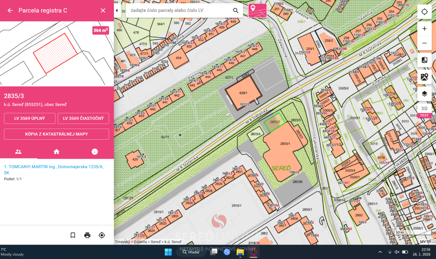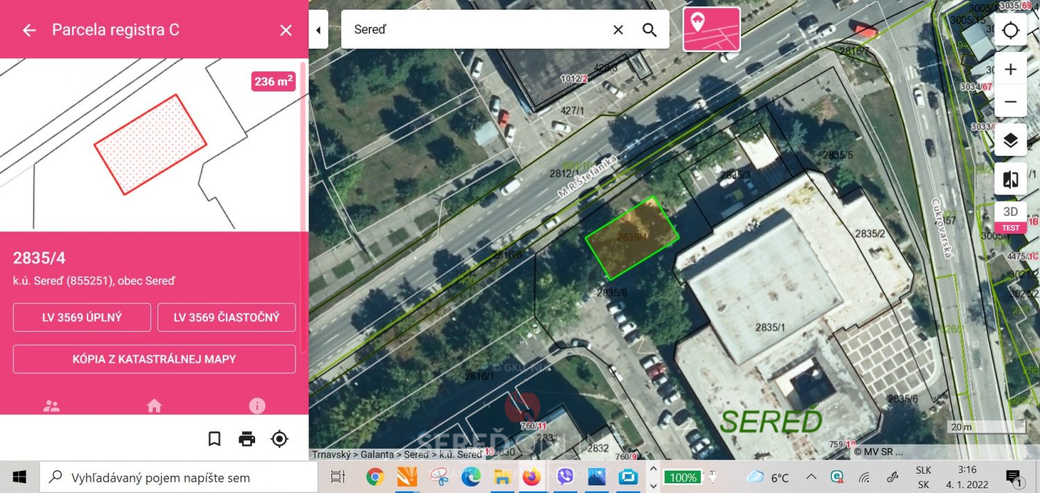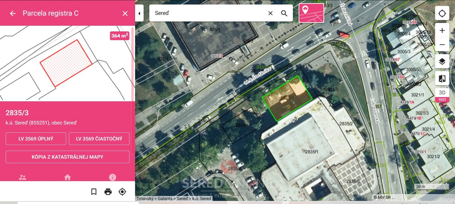 Mesto Sereď (zatiaľ) vlastní okolo lukratívnej budovy v centre mesta tieto pozemky: