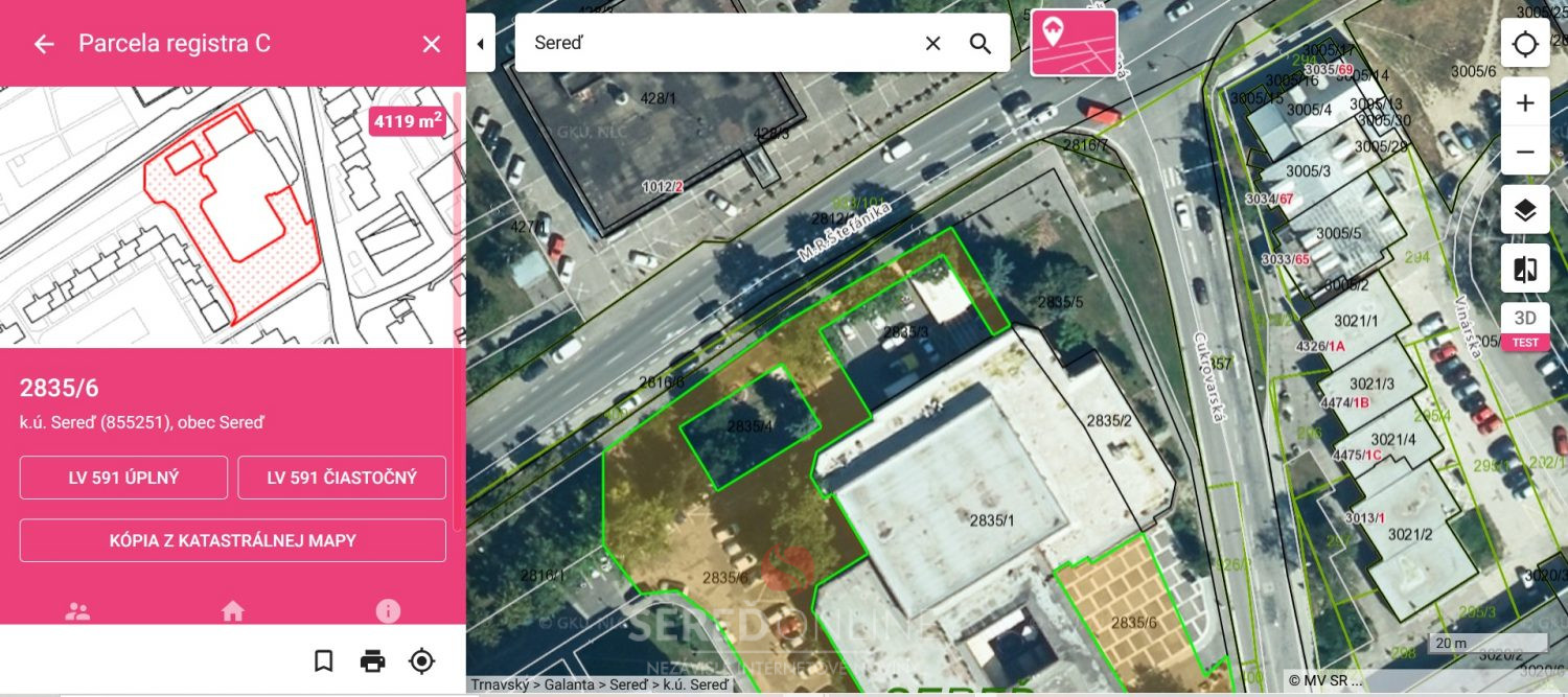 Mesto Sereď (zatiaľ) vlastní okolo lukratívnej budovy v centre mesta tieto pozemky: