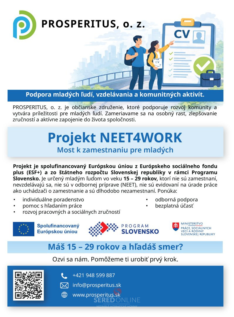 Mesto Sereď | Občianske združenie PROSPERITUS ponúka pomoc mladým ľuďom vo veku od 15 do 29 rokov, ktorí momentálne nepracujú, nepokračujú v štúdiu a nie sú evidovaní na úrade práce. Program je určený aj pre mladých ľudí, ktorí sú dlhodobo bez zamestnania a potrebujú podporu pri hľadaní pracovných príležitostí.