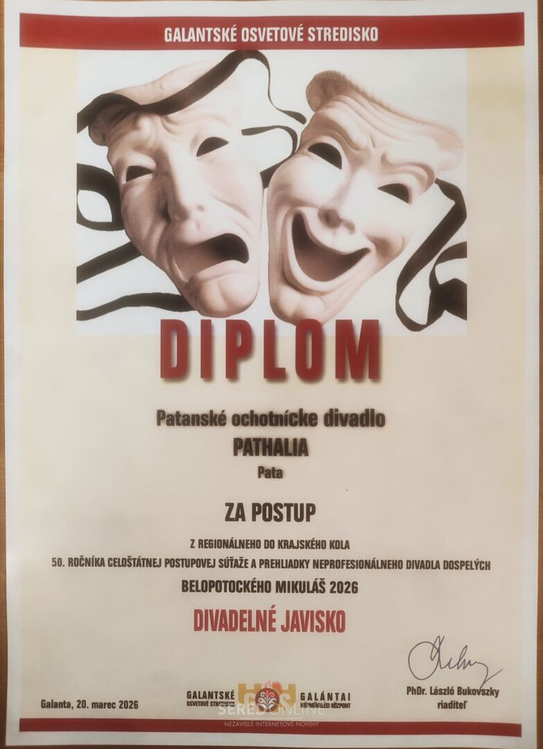 „Milí naši priaznivci, sme radi, že sme dnes po verdikte odbornej poroty postúpili do krajského kola 50. ročníka celoštátnej postupovej súťaže BELOPOTOCKÉHO MIKULÁŠ 2026 s našou hrou – Ten čo paty z Paty vytáhol“