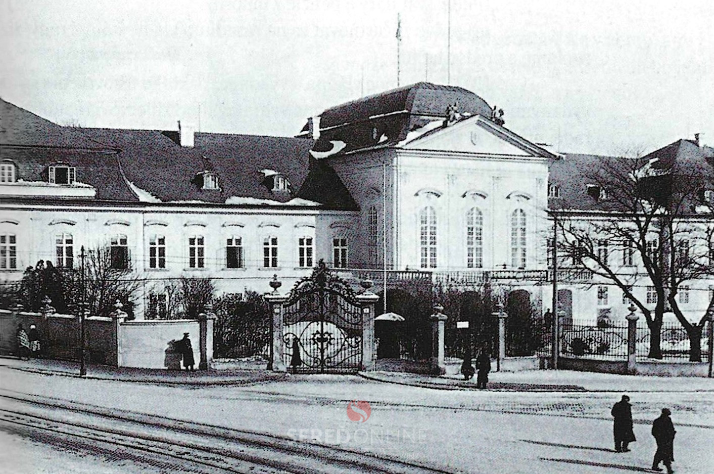 „K architektonickým skvostom Bratislavy patrí rokokový Grassalkovichov palác. Pôvodný letný záhradný palác postavil po roku 1760 pre grófa Antona Grassalkovicha, prezidenta Uhorskej kráľovskej dvorskej komory, viedenský architekt František Anton Hillebrand. V druhej polovici 19. storočia žil v Prešporku arciknieža Friedrich s manželkou Isabellou. Palác si najprv prenajal a roku 1897 ho kúpil za 480 000 zlatých. Palác navštívilo veľa významných osobností. Už roku 1775 to bola Mária Terézia, roku 1883 španielsky kráľ Alfons XII. Viac ráz sem zavítal cisár Franšiek Jozef. Na začiatku 20. storočia bol častým hosťom v paláci následník trónu arciknieža František Ferdinand d’Este. Jeho návštevy však nepatrili žiadnej z dcér arcikniežatského páru, súcich na vydaj. Prichádzal sem za ich dvornou dámou Žofiou Chotekovou. Napriek odporu cisárskeho dvora sa s ňou napokon oženil. Palác prišiel roku 1919 do majetku Československého štátu, stal sa sídlom vojenského veliteľstva. Roku 1939 ho upravili na účely rezidencie prezidenta prvej Slovenskej republiky. Po druhej svetovej vojne bol sídlom Slovenskej národnej rady a neskôr pionierskym palácom. Od roku 1993 je opäť sídlom prezidenta republiky. Pred prezidentským palácom na Hodžovom námestí stojí od roku 1986 fontána Planéta mieru od Tibora Bartfaya.“ (Gažo, Mikuláš – Holčík, Štefan – Zinser, Otto: Bratislava pred sto rokmi a dnes. 2003, strana 137)