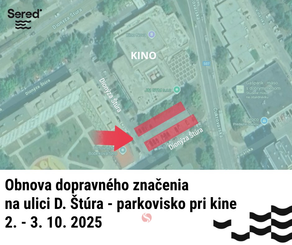 V dňoch: 2. a 3. októbra 2025 (štvrtok, piatok) v čase od 8:00 do 17.00 hod. bude na ulici D. Štúra pri Kine NOVA realizovaná obnova vodorovného dopravného značenia. Súčasne bude odstránené staré a osadené nové zábradlie.