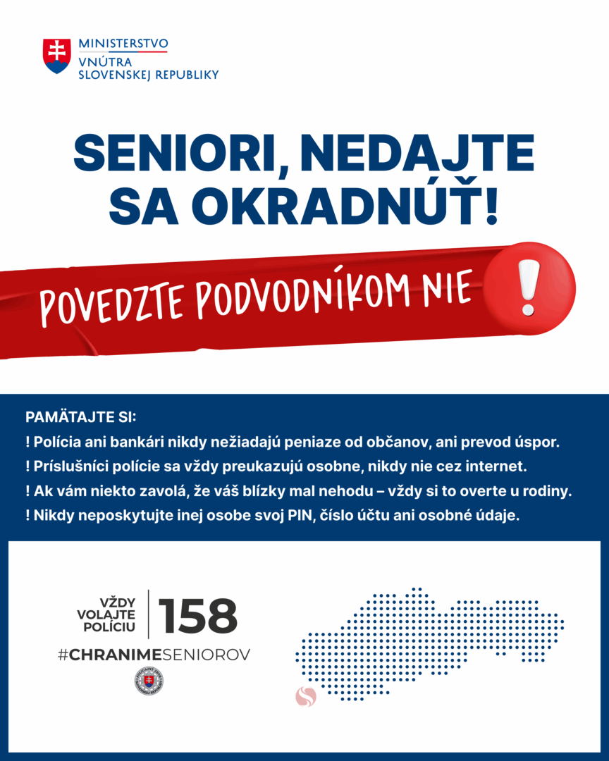 MV SR |MM| Ministerstvo vnútra SR vo štvrtok 2. októbra 2025 odštartovalo preventívnu kampaň, ktorou chce osloviť všetkých seniorov poberajúcich dôchodok v hotovosti, aby nenaleteli podvodníkom. Na Slovensku žije približne 930-tisíc dôchodcov vo veku nad 65 rokov a žiaľ podľa štatistík sa počet evidovaných prípadov, kedy sa práve seniori stávajú obeťami podvodníkov zvyšuje. Kampaňou chce ministerstvo ešte viac apelovať na seniorov, aby boli ostražití.