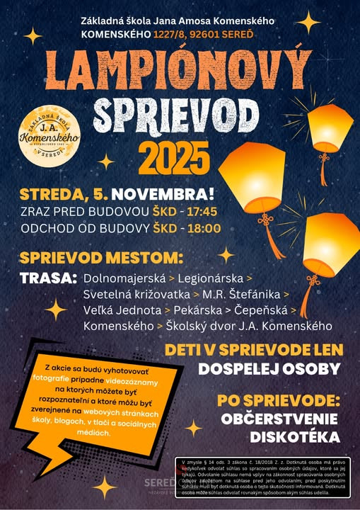 Už na budúci týždeň 5. novembra rozžiaria ulice nášho mesta lampióny. Túto obľúbenú akciu detí a rodičov organizuje Základná škola J.A. Komenského každoročne. Zraz pred ŠKD bude o 17.45 hod.