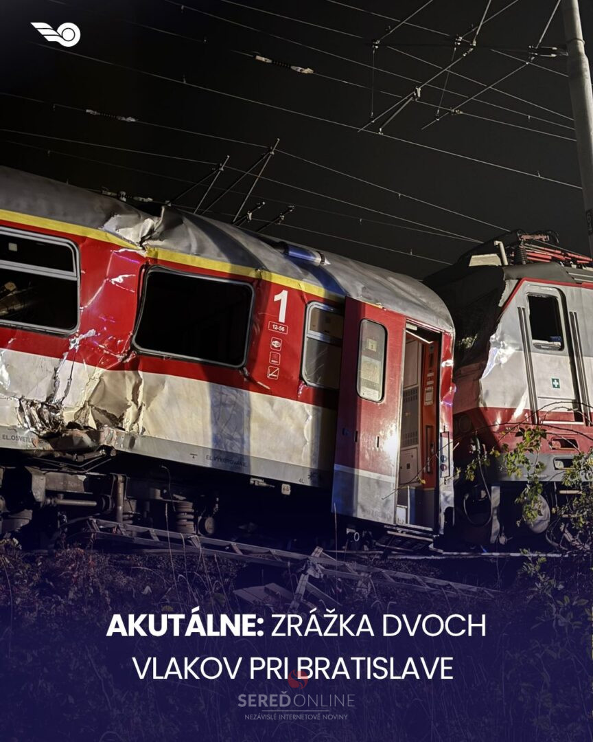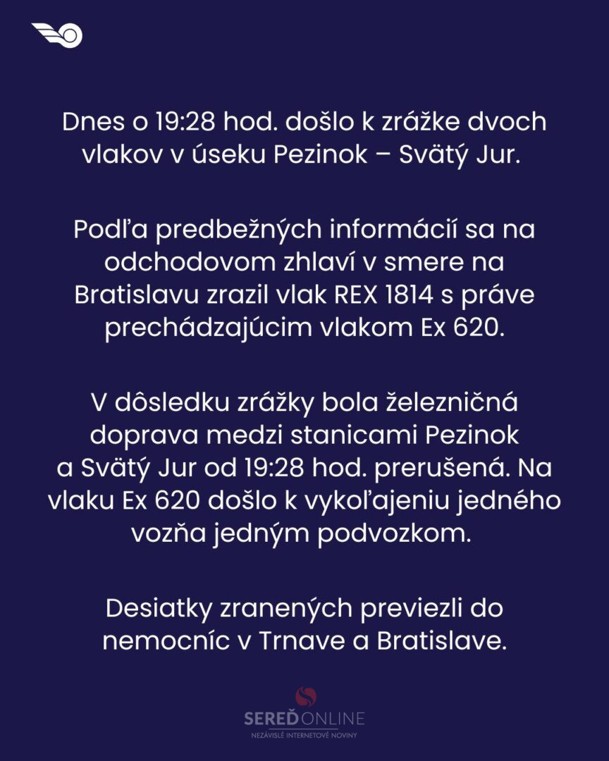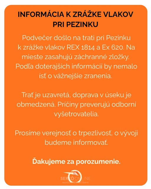 V čase 19:31 hod. sme na linke 158 prijali oznam o zrážke dvoch vlakov na úseku Pezinok – Bratislava Hlavná stanica.