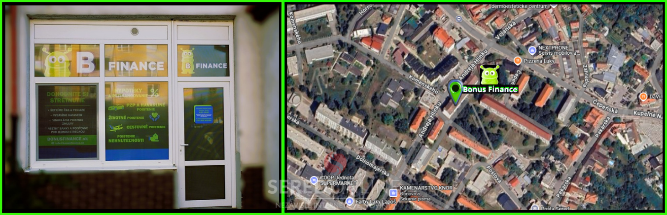 Nájdeš nás na A. Hlinku 3058/17 v Seredi, v novo otvorenej kancelárii Bonus Finance. Stretnutia sú na objednávku na tel. čísle: 0910 304 054 – dohodni si konkrétny čas a venujeme sa ti naplno, alebo e-mailom na: info@bonusfinance.sk.
