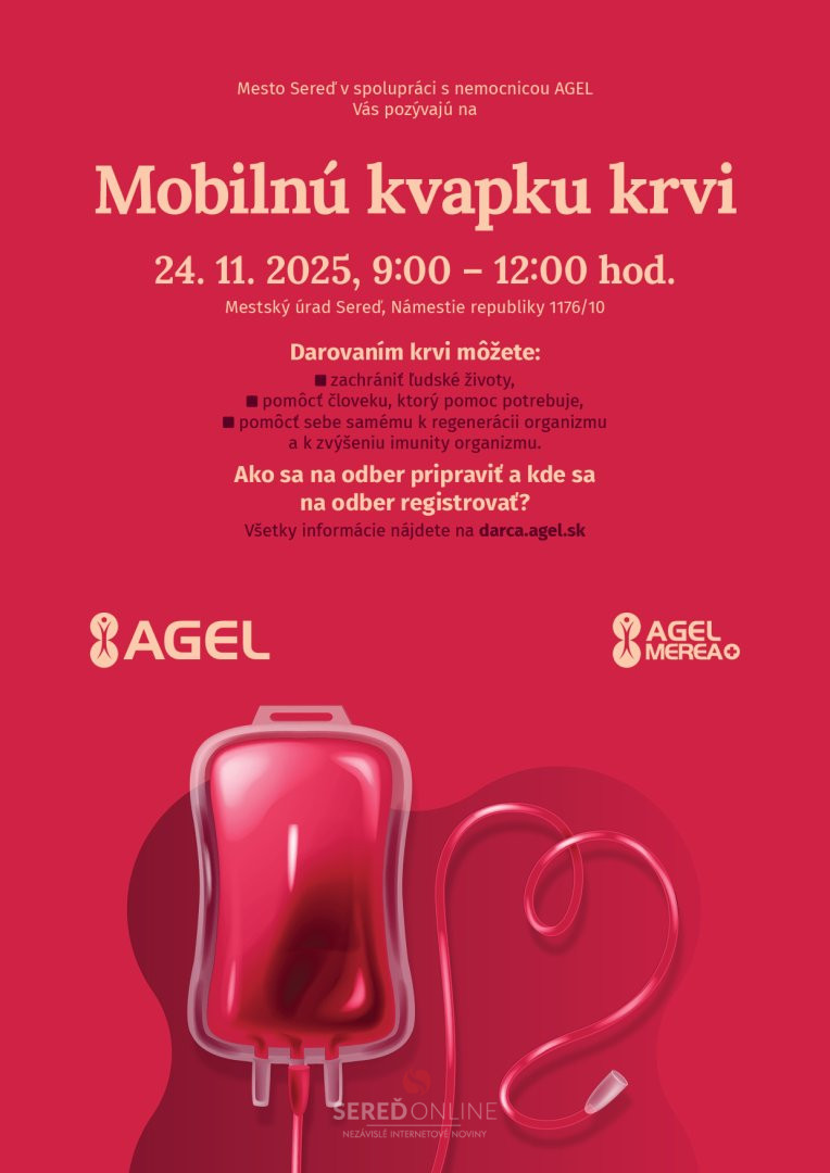 Mesto Sereď | Pozývame všetkých dobrovoľných darcov krvi na najbližší mobilný odber krvi v Seredi, v pondelok 24. novembra 2025, ktorý organizuje mesto Sereď v spolupráci s Nemocnicou AGEL.