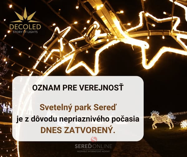 Vážení návštevníci Svetelného parku Sereď, v mene organizátora – spoločnosti Decoled Story of Lights Slovensko vás informujeme, že park dnes – 25. novembra – NEOTVORÍ SVOJE BRÁNY.