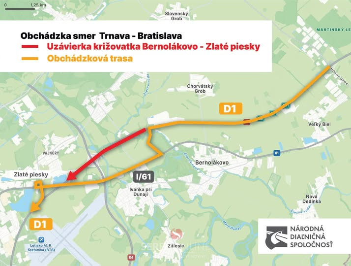 Upozorňujeme vodičov, že v sobotu (29.11.2025) v čase o 10:00 hod. dôjde k uzavretiu diaľnice D1 v smere do Bratislavy a to v úseku od križovatky „Bernolákovo“ po križovatku „Zlaté Piesky“.