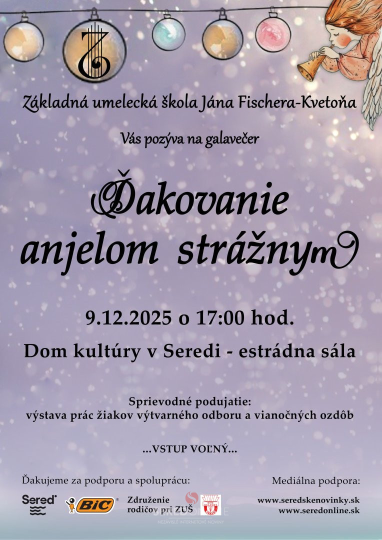 ZUŠ Sereď | Základná umelecká škola Jána Fischera-Kvetoňa Vás pozýva na galavečer Ďakovanie anjelom strážnym, ktoré sa bude konať 9.12.2025 o 17:00 hod. v Dome kultúry v Seredi – estrádna sála.