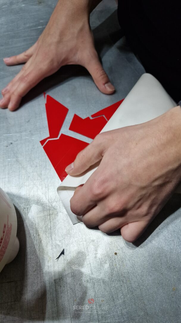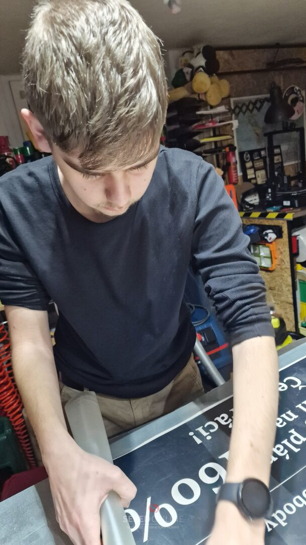 Svetelný box visí na kovových retiazkach a je pred finálnym dokončením.