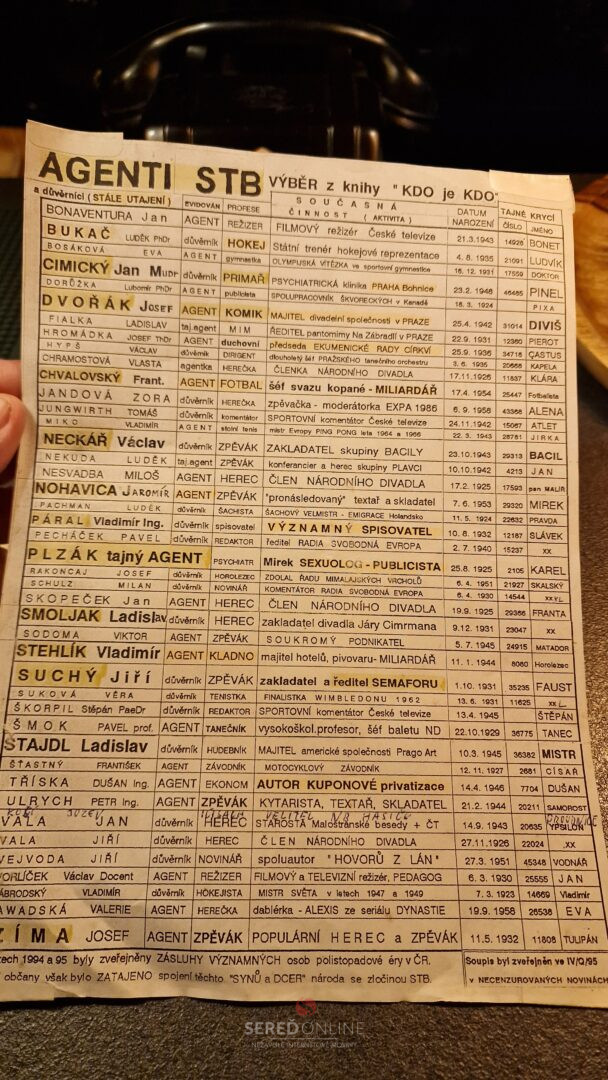 ??? 4. januára 2026, 14:03 – toto je zhruba 33 až 35 rocny zoznam zachovany v Ceskej republike. Vychadzajuc z obsahu, je vytvoreny z evidencie STB. Doplnene v nom su udaje o tom, kto co robi, ako bol ci je VEREJNE aktivny a pod.