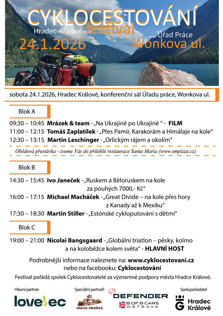 Hlavním programem bude projekce prvního dánského cyklocestovatele, který objel svět, Nicolaie Bangsgaarda o jeho globálním triatlonu – podruhé kolem světa, tentokráte na koloběžce, běžecky a na kole. Za tahák festivalu lze určitě považovat projekci cyklodobrodruha Michaela Macháčka o jeho přejezdu z Kanady až do Mexika po legendární trase Great Divide. Pro vrcholové nadšence je tu pak beseda Tomáše Zaplatílka, který vás protáhne na kole přes Karakorám, Himálaje i Pamír.
