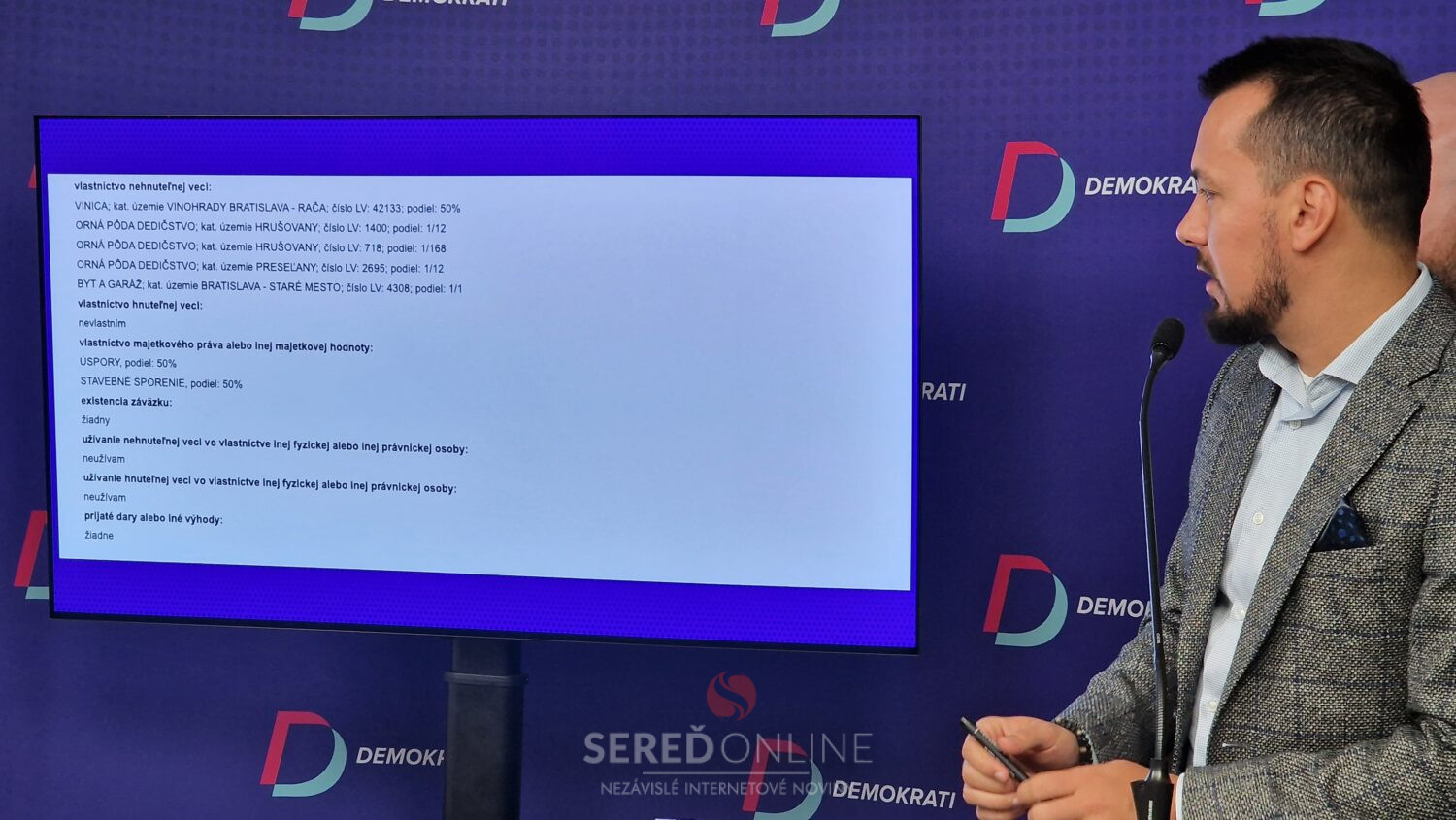 Strana Demokrati zásadne odmieta návrh zákona, ktorým chce vládna koalícia obmedziť a pokutovať prepojovanie verejne dostupných údajov z katastra s majetkovými priznaniami verejných funkcionárov. Podľa Demokratov ide o nebezpečný precedens, ktorý oslabuje verejnú kontrolu moci a chráni politické kšefty. Ilustrujú to na príklade bytu Roberta Fica, ktorý nevie dôveryhodne vysvetliť ako ho zaplatil.