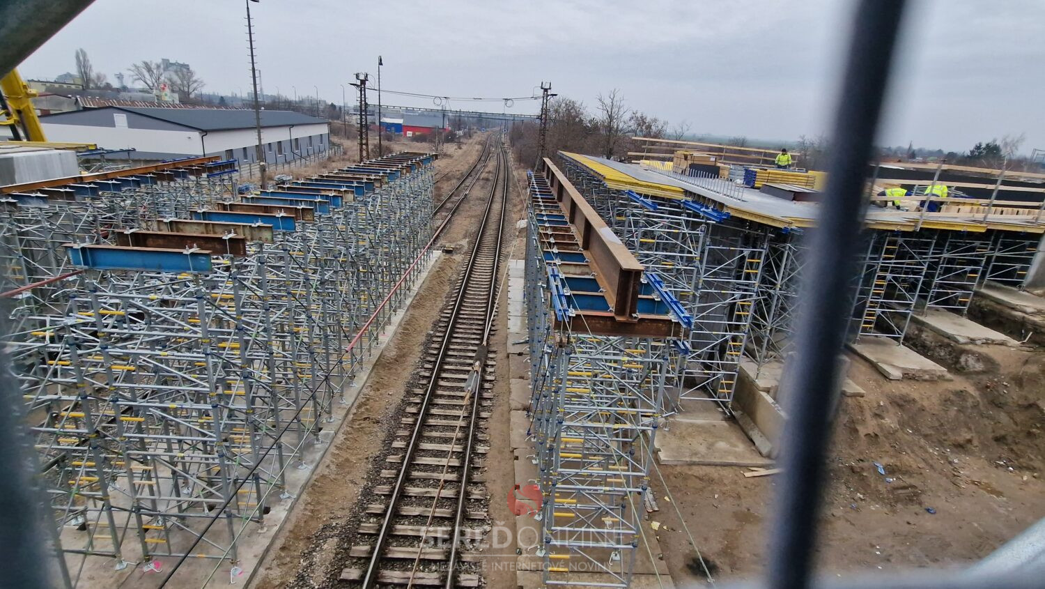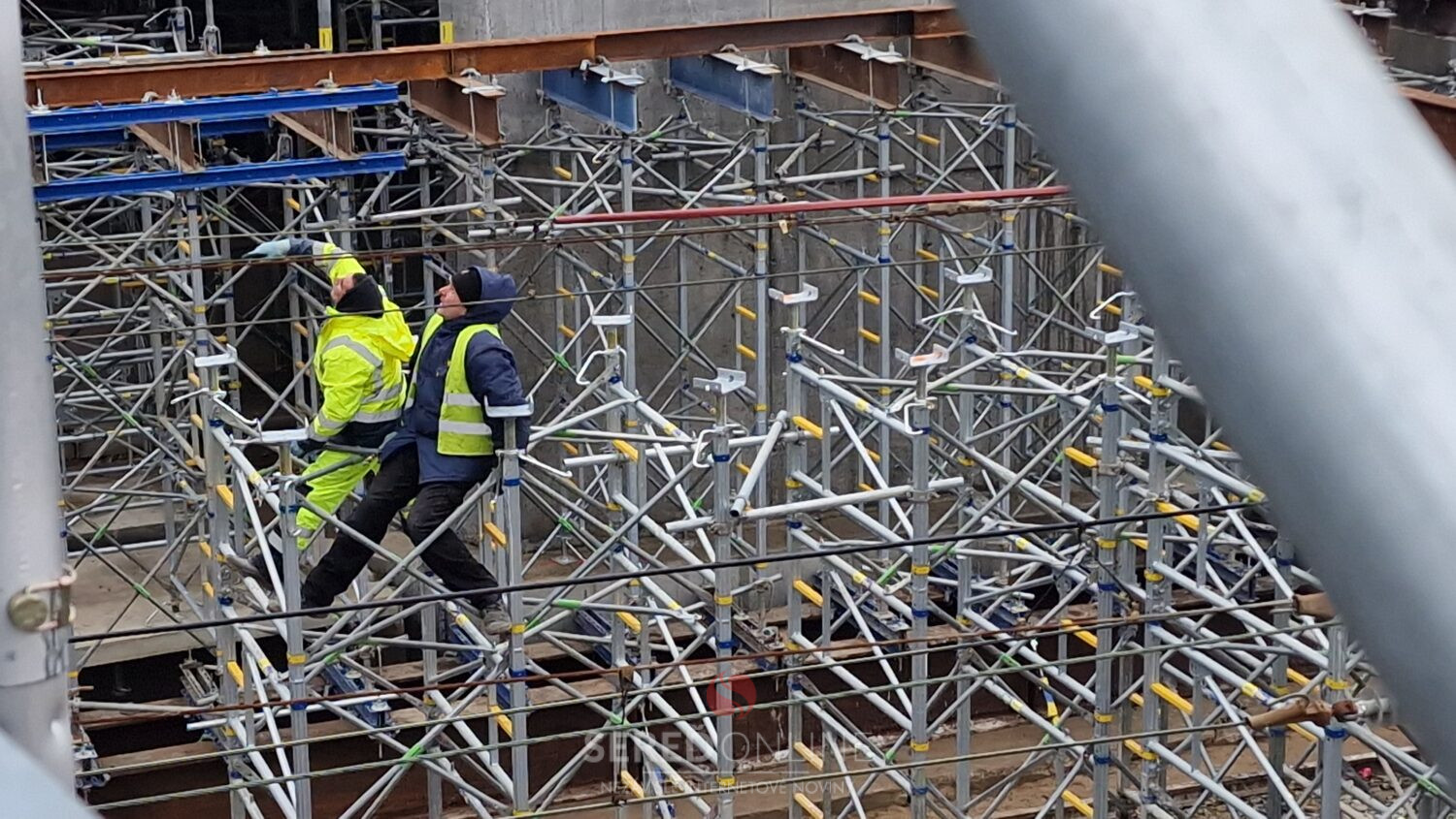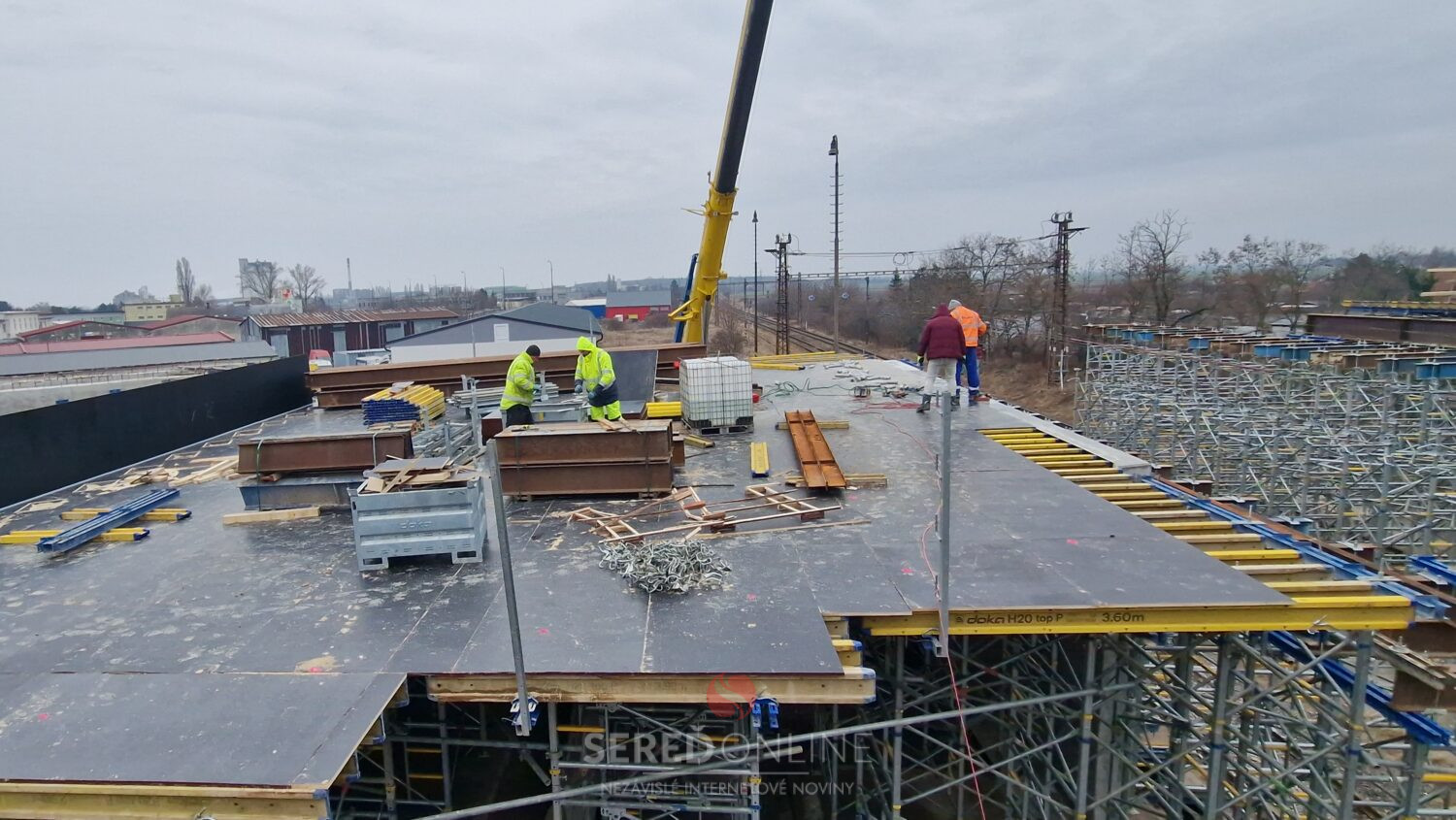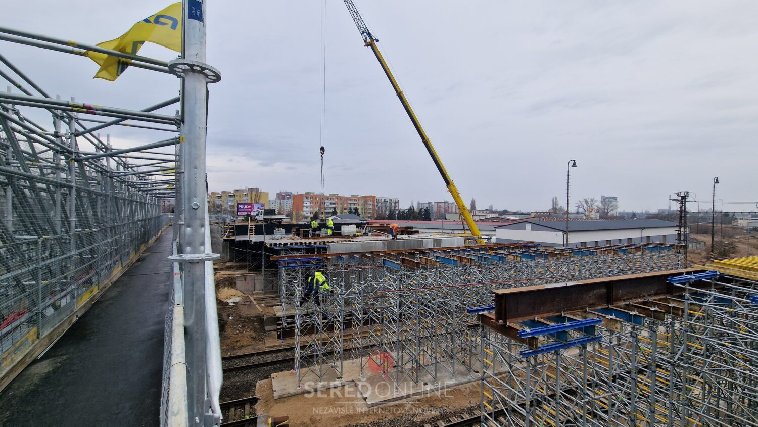 Aj dnes, teda v nedeľu na výstavbe mosta vidieť čulý ruch. Dva žeriavy a nie málo pracovníkov pracujúcich vo výškach na oceľových konštrukciách a pribúdajúce komponenty stále viac spevňujúce budované konštrukcie. To vidíme z postavenej lávky.