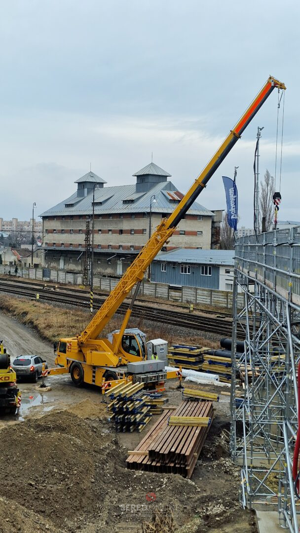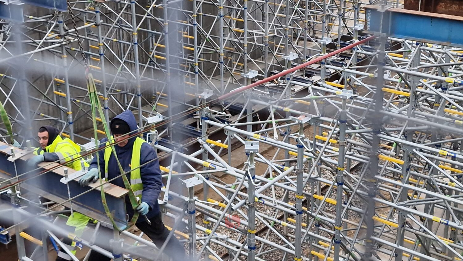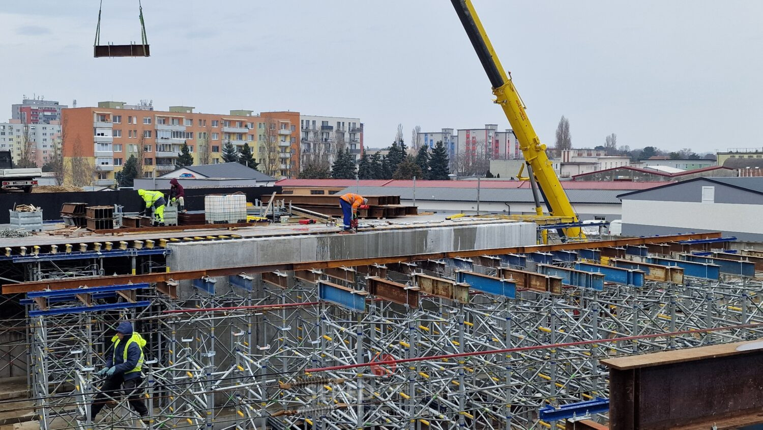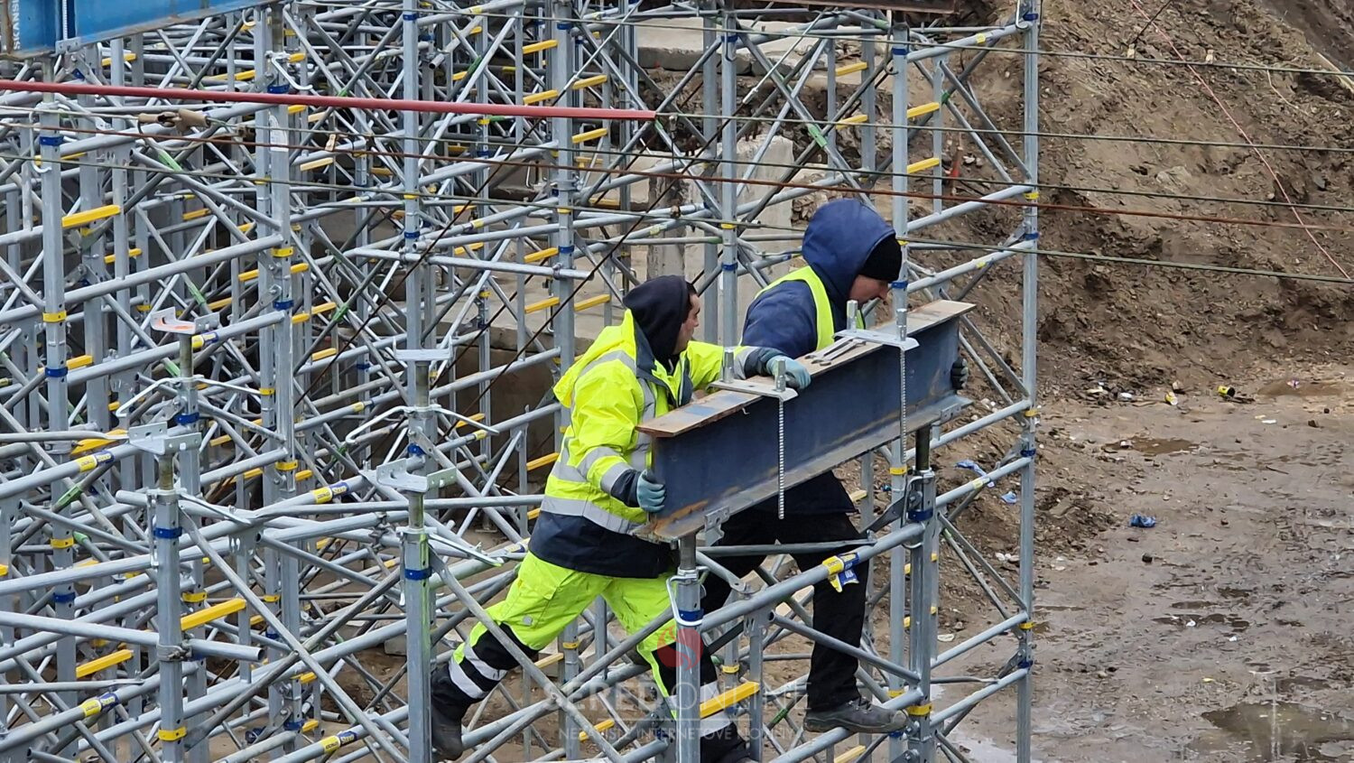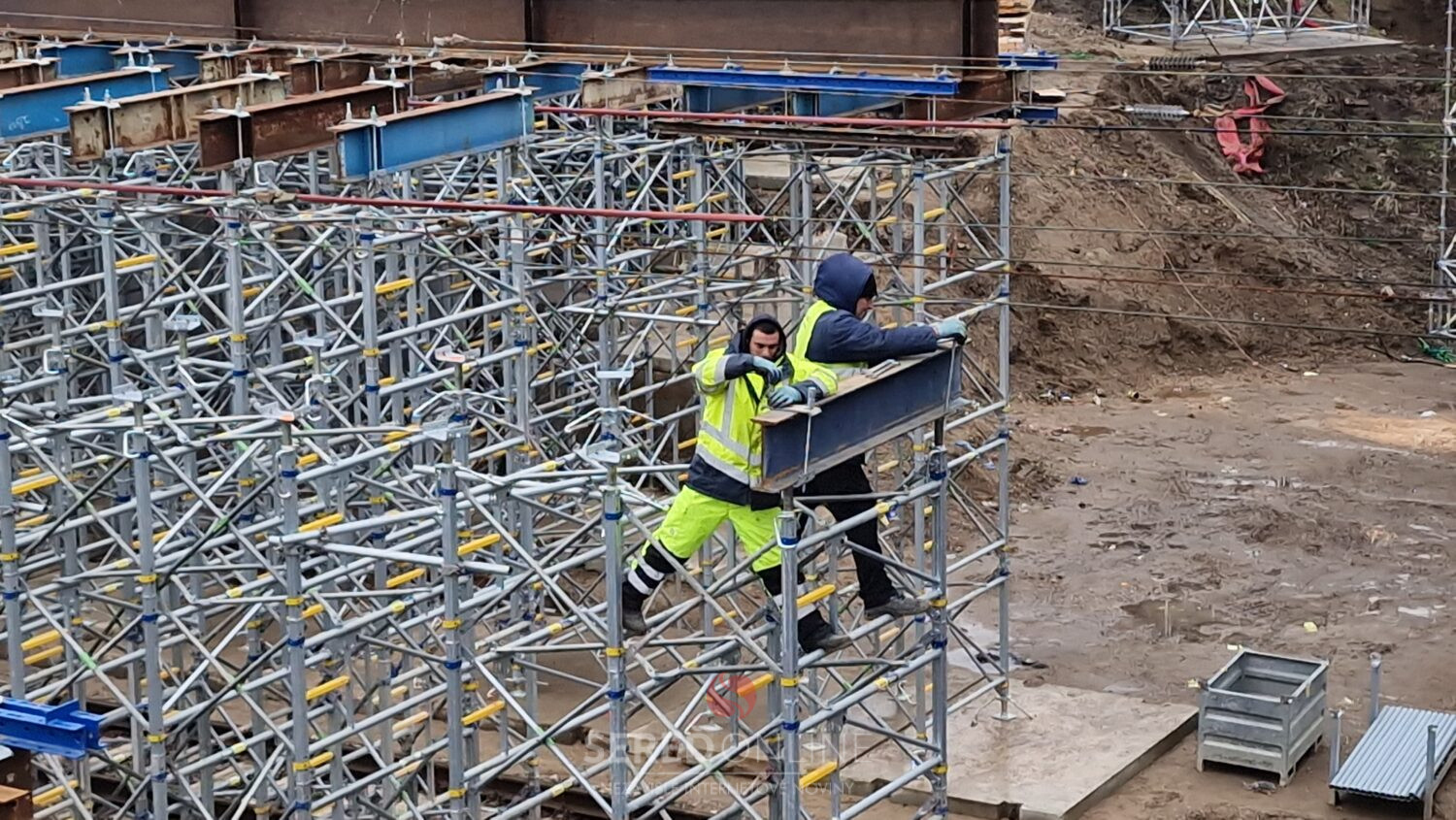 Aj dnes, teda v nedeľu na výstavbe mosta vidieť čulý ruch. Dva žeriavy a nie málo pracovníkov pracujúcich vo výškach na oceľových konštrukciách a pribúdajúce komponenty stále viac spevňujúce budované konštrukcie. To vidíme z postavenej lávky.