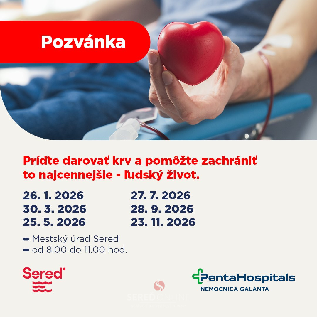 Pravidelná mobilná kvapka krvi sa v Seredi koná každý druhý mesiac, v malej zasadačke Mestského úradu, a to v novom čase od 8.00 do 11.00 hod. Darcovia sa nemusia vopred registrovať – stačí prísť, mať dobrý zdravotný stav a chuť urobiť niečo zmysluplné pre druhých.