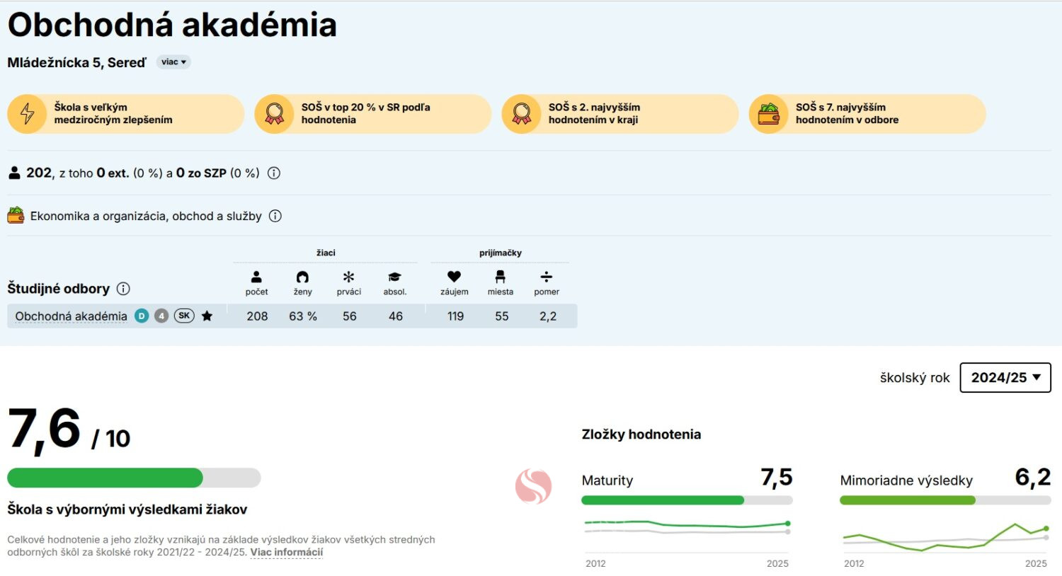 Obchodná akadémia Sereď sa umiestnila na 23. mieste z 340 hodnotených stredných odborných škôl v celoslovenskom meradle, z toho zároveň na 2. mieste z 32 stredných odborných škôl v Trnavskom kraji.