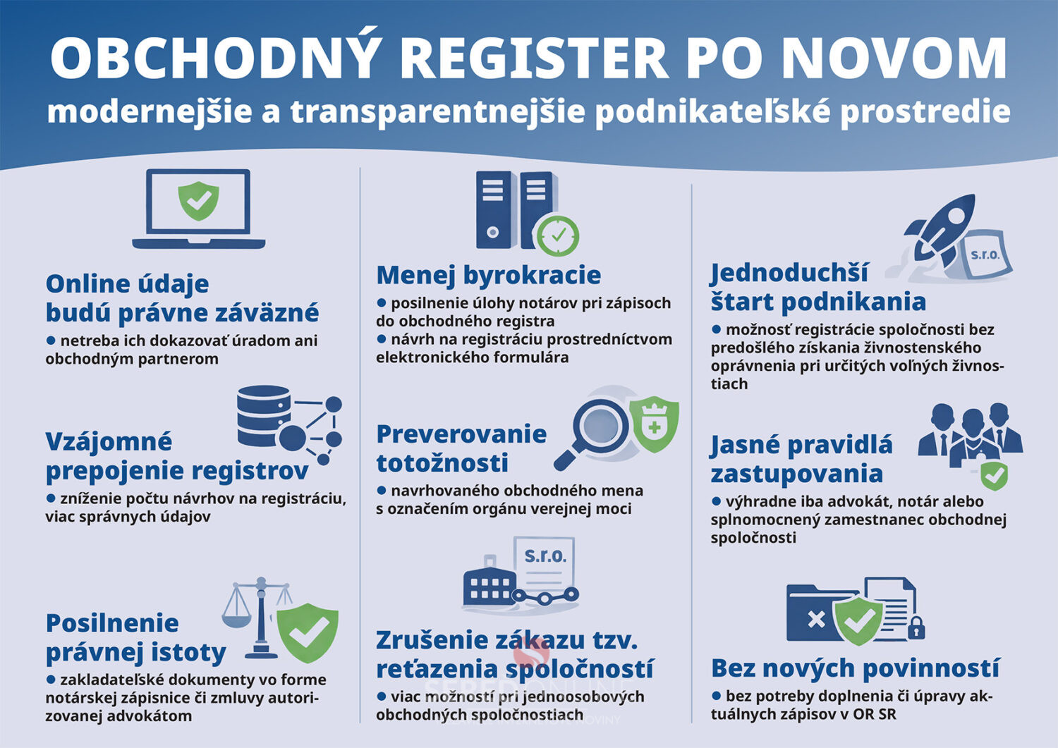 MS SR |MM| Vládny návrh zákona o obchodnom registri, ktorý tento týždeň schválila Národná rada SR, prináša viacero zásadných noviniek, ktoré výrazne ovplyvnia registrovú prax v podmienkach Slovenskej republiky.