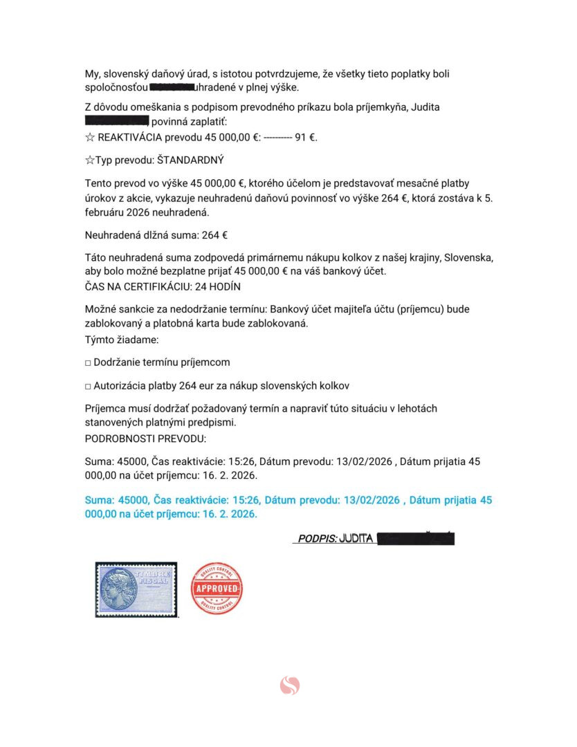 - Falošná terminológia: Žiadajú úhradu za „reaktiváciu prevodu“ či „primárny nákup kolkov“, čo sú fiktívne poplatky, ktoré finančná správa nikdy nevyžaduje.