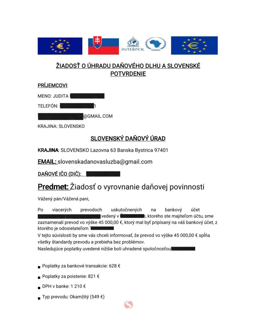 Podvodníci zasielajú falošné „žiadosti o úhradu daňového dlhu“ alebo „potvrdenia“ o prevodoch finančných prostriedkov, neraz aj s hlavičkami zahraničných inštitúcií (napr. INTERPOL alebo AFRIPOL). Uvádzajú tiež konkrétne identifikačné údaje subjektu (názov firmy, IČO, meno zodpovednej osoby, telefónne číslo), aby pôsobili dôveryhodne. V niektorých prípadoch zasielajú aj falošné „potvrdenia“ o prevodoch finančných prostriedkov alebo žiadajú úhradu poplatkov za „reaktiváciu prevodu“, „kolky“ či údajnú daňovú povinnosť v krátkej lehote (napr. do 24 hodín), pričom sa vyhrážajú zablokovaním bankového účtu alebo platobnej karty.