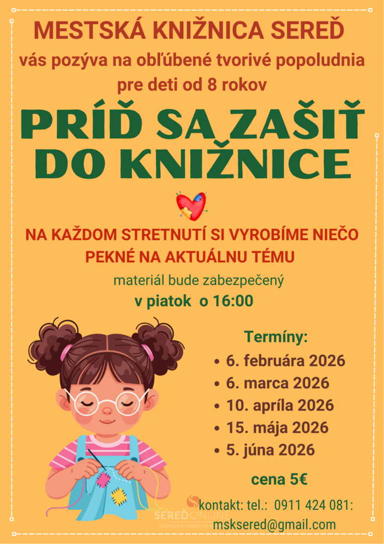 Kreatívne tvorenie sa koná v Mestskej knižnici zvyčajne v prvý piatok v mesiaci medzi 15:30 – 17:00. Vytvárame rôzne pekné veci nie len z textilu. Všetko potrebné bude pripravené. Cena 5€