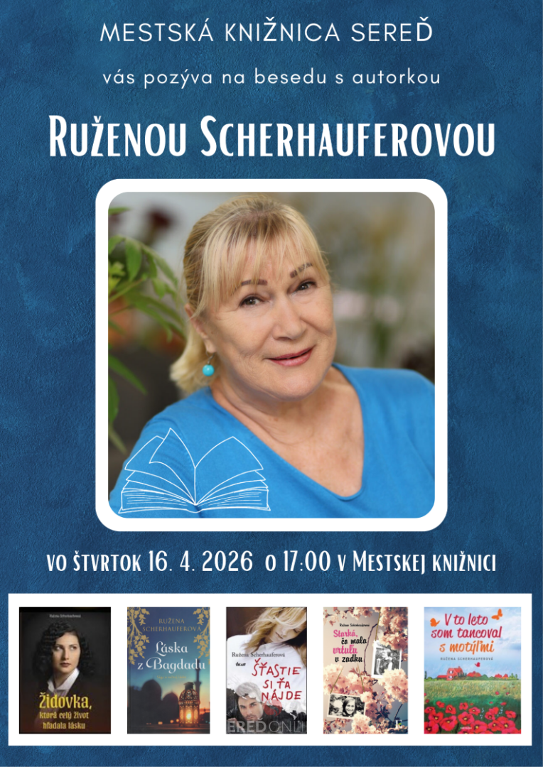 Príďte stráviť príjemný literárny večer s autorkou Ruženou Scherhauferovou. V knižnici nás čaká zaujímavé a inšpiratívne rozprávanie o jej tvorbe, zákulisí písania, o príbehoch a tom, čo ju motivuje tvoriť. Beseda ponúkne priestor na vaše otázky a osobné stretnutie s autorkou. Vstup voľný.