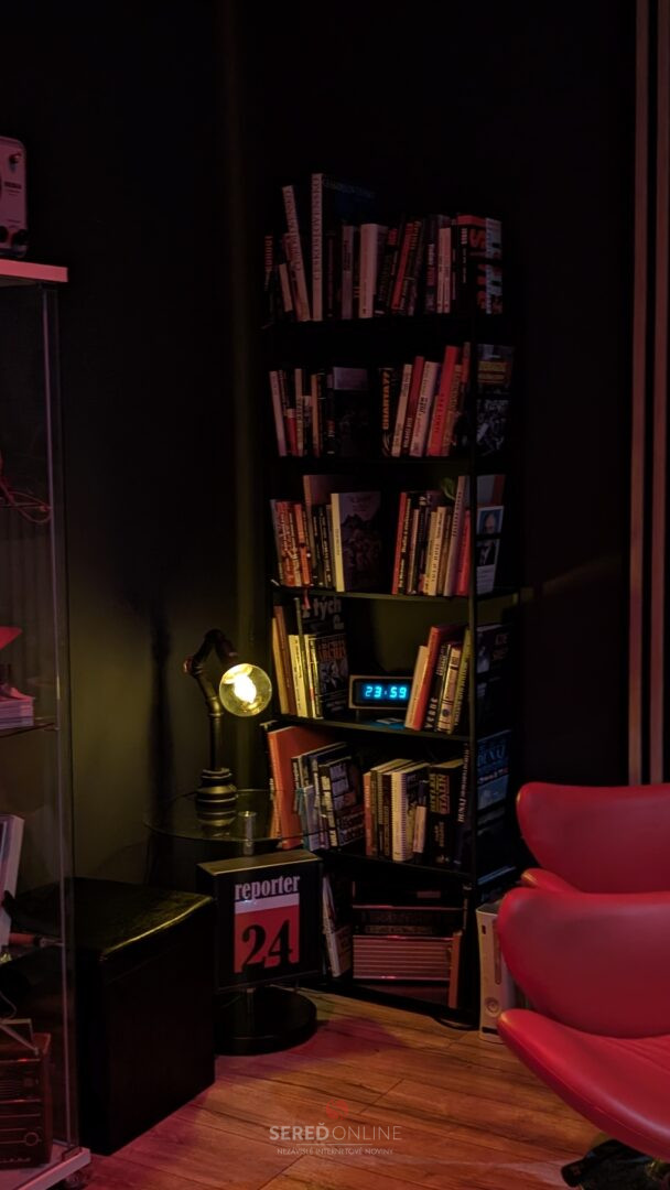Priestor je doplnený o knižnicu s mimoriadne zaujímavými knižnými titulmi, konferenčný stolík s podsvietenými logami (Reporter24.sk, Muzeum totality a pod.) a dvomi taburetkami.