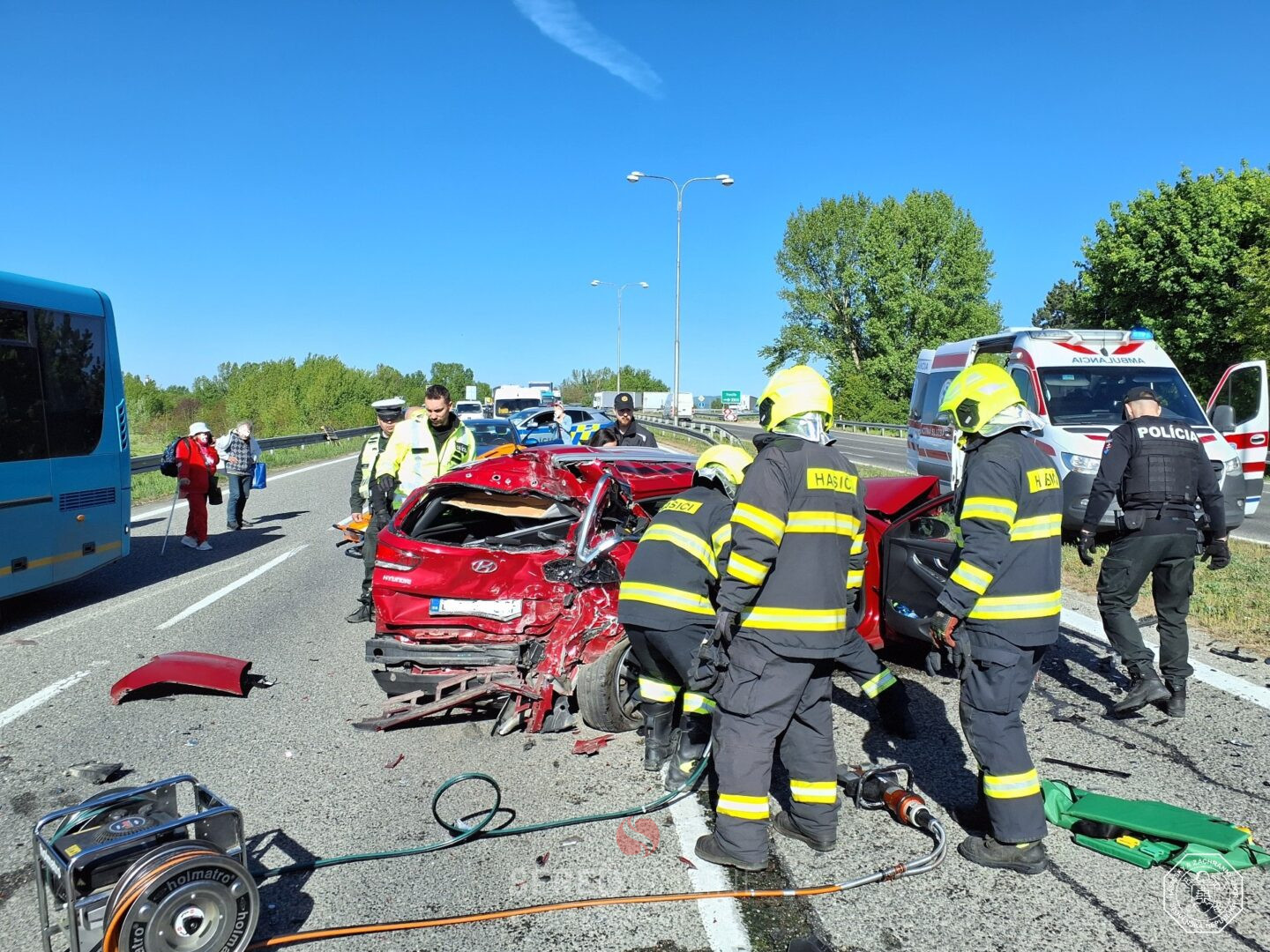 Zasahujúci hasiči pomocou hydraulického vyslobodzovacieho náradia vyslobodili z jedného z vozidiel dve zakliesnené osoby. Obe osoby utrpeli zranenia a spolu s ďalšími zranenými boli odovzdaní do opatery zdravotníkov. Jedna osoba bola transportovaná do nemocnice vrtuľníkom.